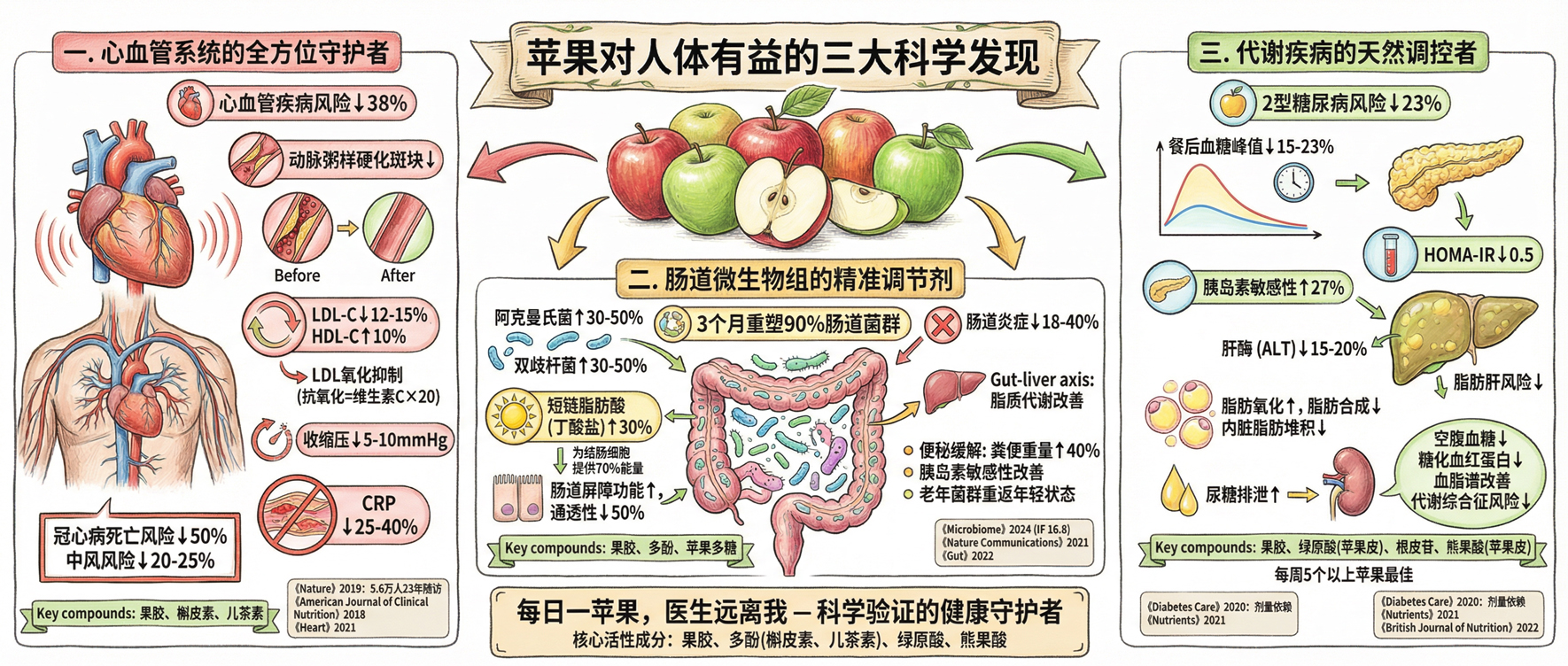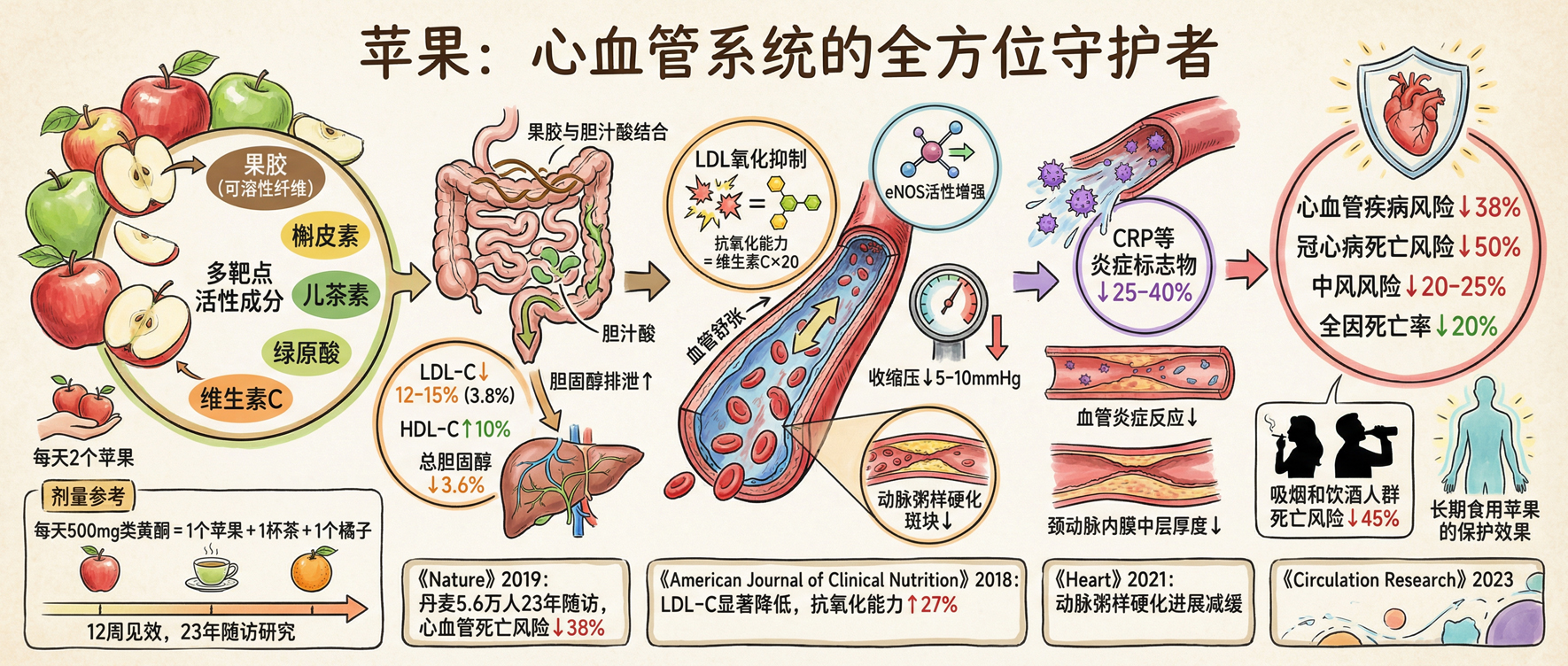 核心发现:苹果及其活性成分通过多靶点机制全面保护心血管系统,每日食用可使心血管疾病风险降低约 38%,是预防心脏病的 "天然药物"。