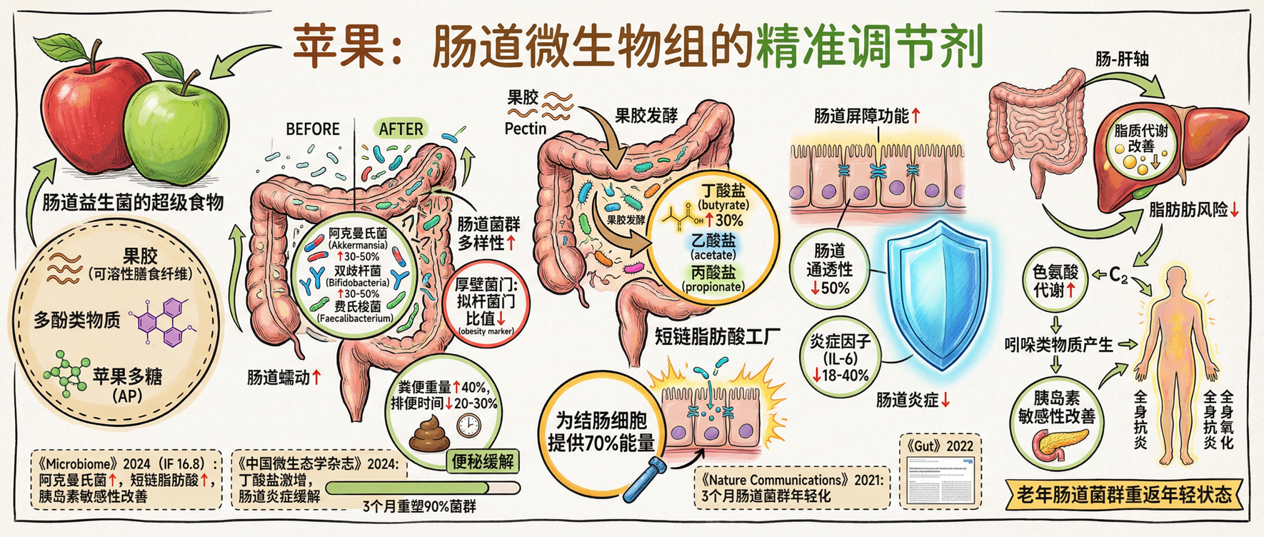 胆固醇调控:果胶 (苹果中主要可溶性纤维) 与肠道胆汁酸结合,促进胆固醇排泄,使 LDL-C (坏胆固醇) 水平降低 12-15%,HDL-C (好胆固醇) 上升约 10%,每天食用 2 个苹果的轻度高胆固醇成人,总胆固醇可降低 3.6%,LDL-C 降低 3.8%。