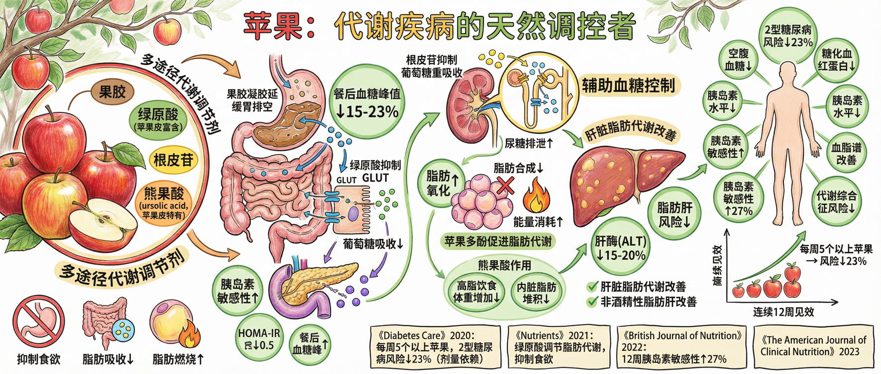 《American Journal of Clinical Nutrition》随机对照试验:每日食用 2 个苹果的高胆固醇患者,12 周后 LDL-C 显著降低,且抗氧化能力提升 27%。
